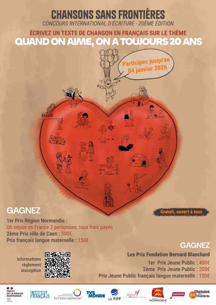 Concours International d’Écriture – Chansons sans Frontières, 20ème édition Écrivez un texte de chanson en français sur le thème :« Quand on aime, on a toujours 20 ans » Participez jusqu’au 04 janvier 2026Gratuit et ouvert à tous ! À gagner :1er Prix Région Normandie : un séjour en France pour 2 personnes, tous frais […]
