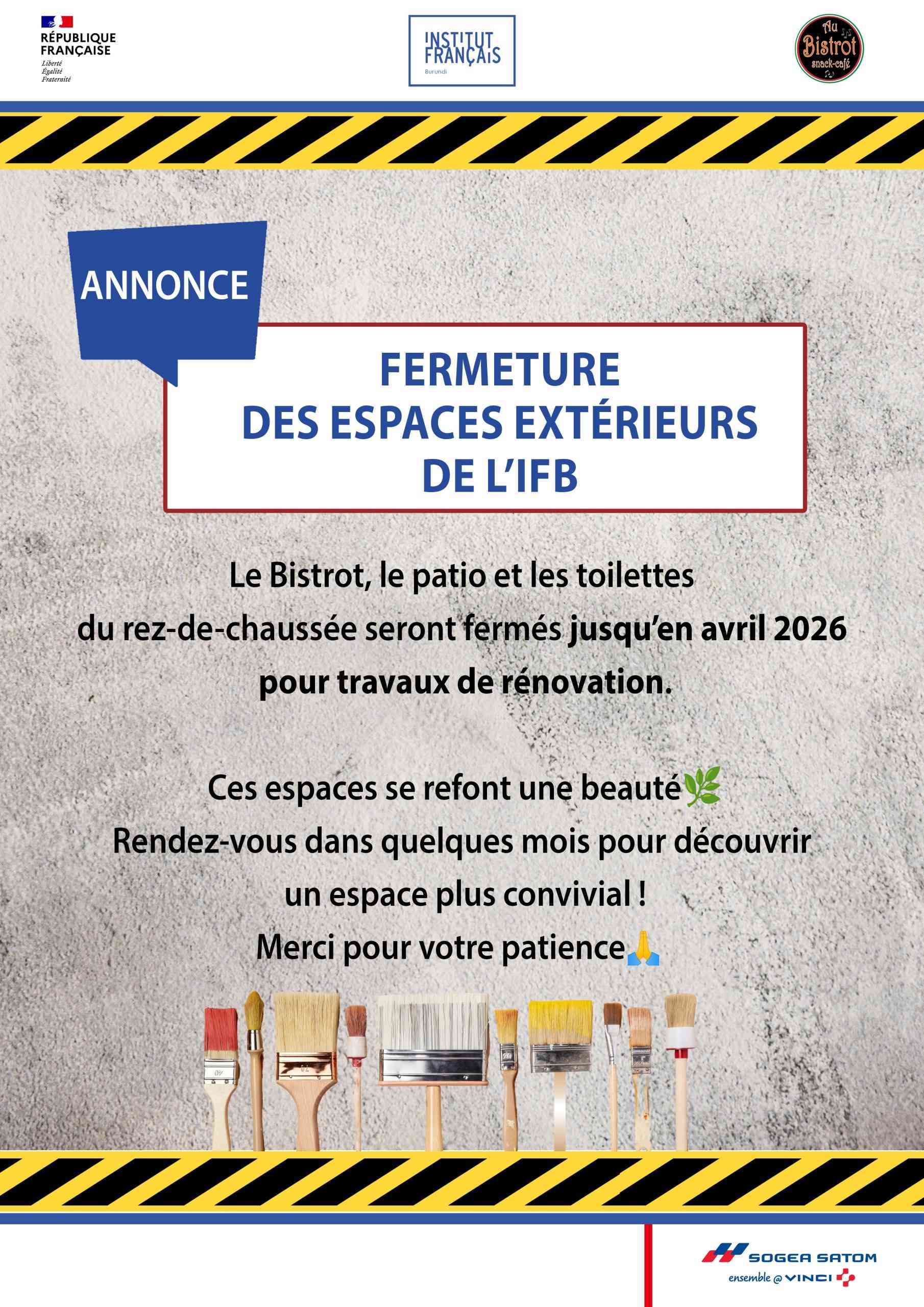 Le Bistrot, le Patio et les toilettes extérieurs de l’IFB seront fermés jusqu’en avril 2026 pour rénovation.