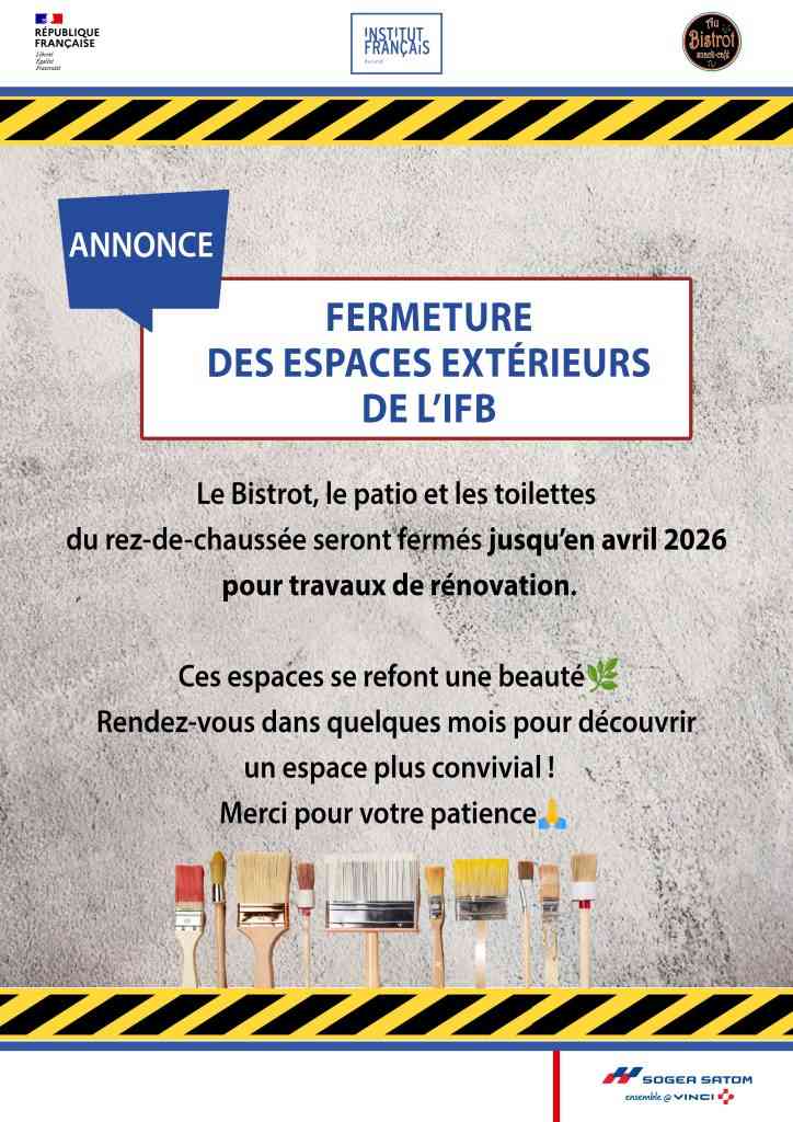 Le Bistrot, le Patio et les toilettes extérieurs de l’IFB seront fermés jusqu’en avril 2026 pour rénovation. On vous prépare un tout nouvel espace, encore plus accueillant ! Merci pour votre patience